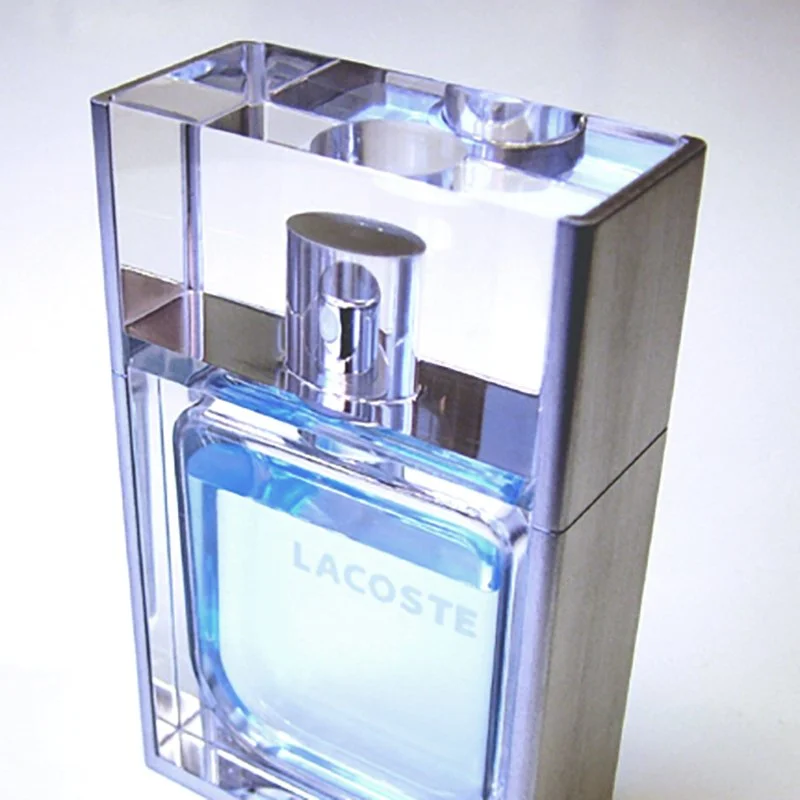 The model was created from 2D orthographic views of the original fragrance bottle, replicated in 3D CAD. The final model was made from a combination of machined Perspex and aluminium, with a translucent spray finish applied to the inside to give the illusion of the fragrance inside.